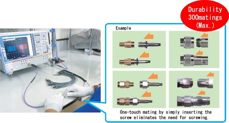 This quick adapter enables one-touch mating and is ideal for measurement sites due to its low transmission loss and high performance.